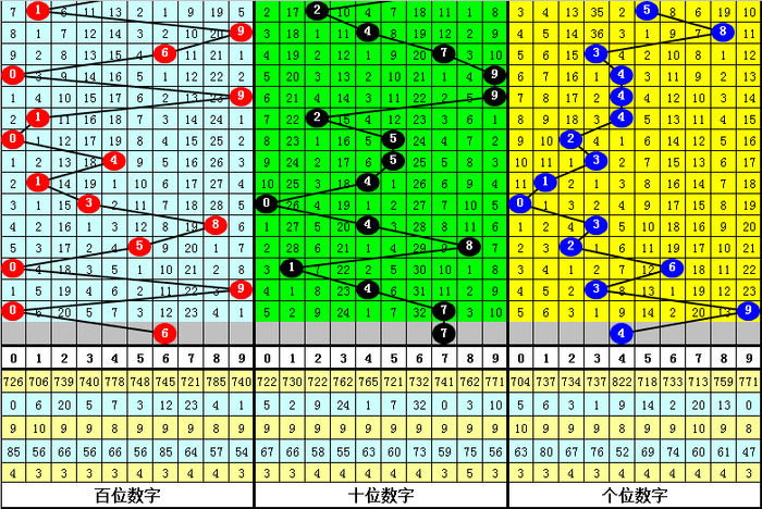 百位走势:近10期在0-9之间出号,跨度为10点,出号比较分散,上期奖号为0,下降9点,本期看好该位上升。另外近10期该位大小比为3:7,大号较冷,本期注意大号回补,关注号码6。