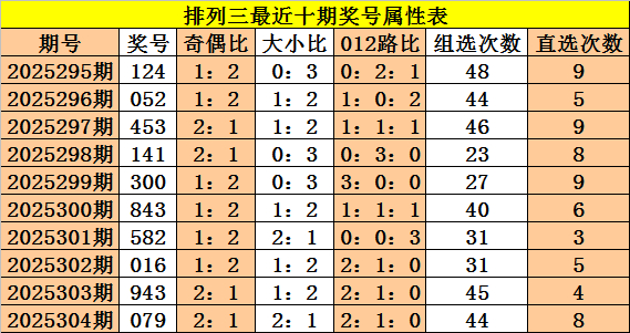 上期回顾:体彩排列三第2025304期奖号:079,奇偶比2:1,大小比2:1,012比2:1:0。