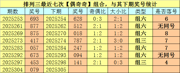 奇偶分析:排列三上期奖号为079,其奇偶类型为【偶奇奇】,最近七次出现奇偶类型偶奇奇的号码分别为:693、877、875、417、057、673、453,其下期奖号分别为:693、877、875、417、057、673、453。其中号码奇偶比为9:12,奇偶奖号开出比例基本相当,本期奇数热出的可能性较大,预计出现2个奇数号码。