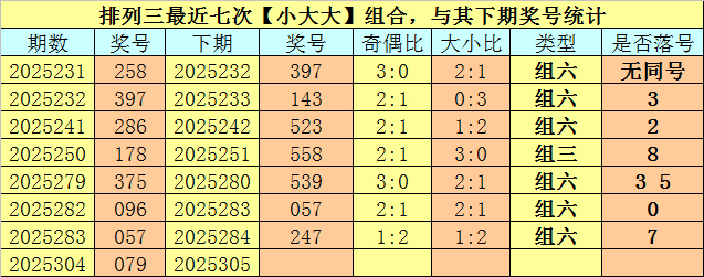 大小分析:排列三上期开出号码079,大小类型为【小大大】,最近七次开出大小类型小大大的奖号分别为:258、397、286、178、375、096、057,其下期分别开出号码:397、143、523、558、539、057、247。其中号码大小比为11:10,大小 号码基本持平,本期预计大号转热,注意全大组合开出。